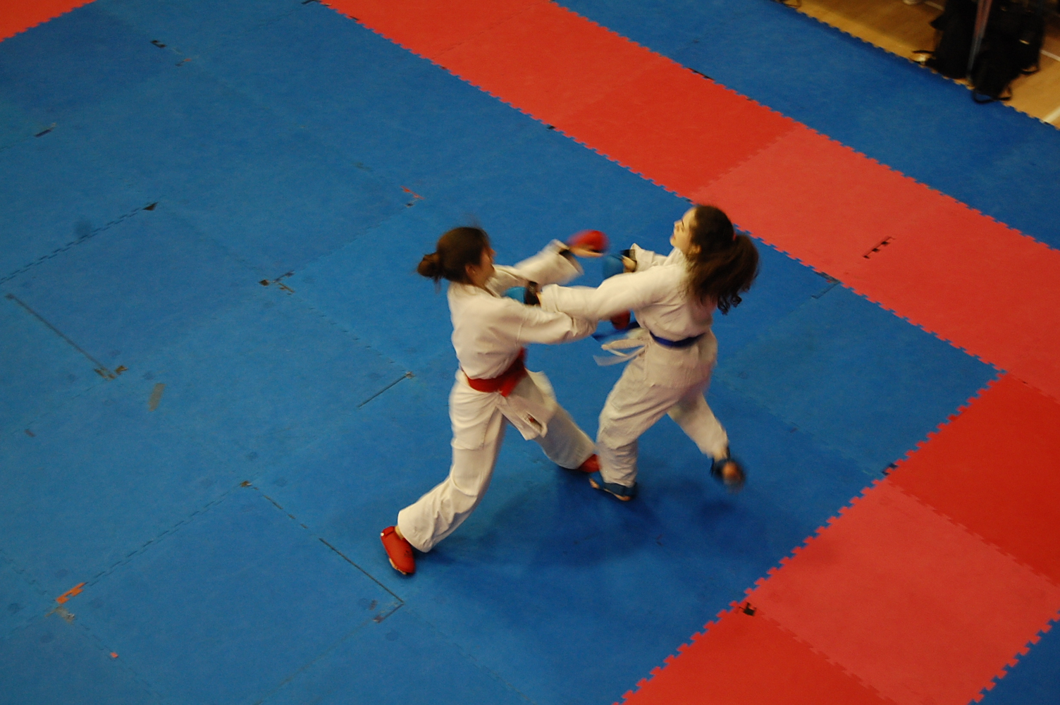That said, kumite (fights) can look rather aggressive. And when I stepped on the mat, all geared up with shin, foot and hand pads, a chest guard and a mouth shield, I felt pretty intimidated. I’m not an aggressive person. Would I be able to actually fight someone? I should note that karate is very different from fight club in that it severely restricts the range of moves that are appropriate. Excessive contact doesn’t get you a prize, it gets you disqualified. Nevertheless, as my opponent approached me and hit me in the head, the experience proved to be anything but gentle.