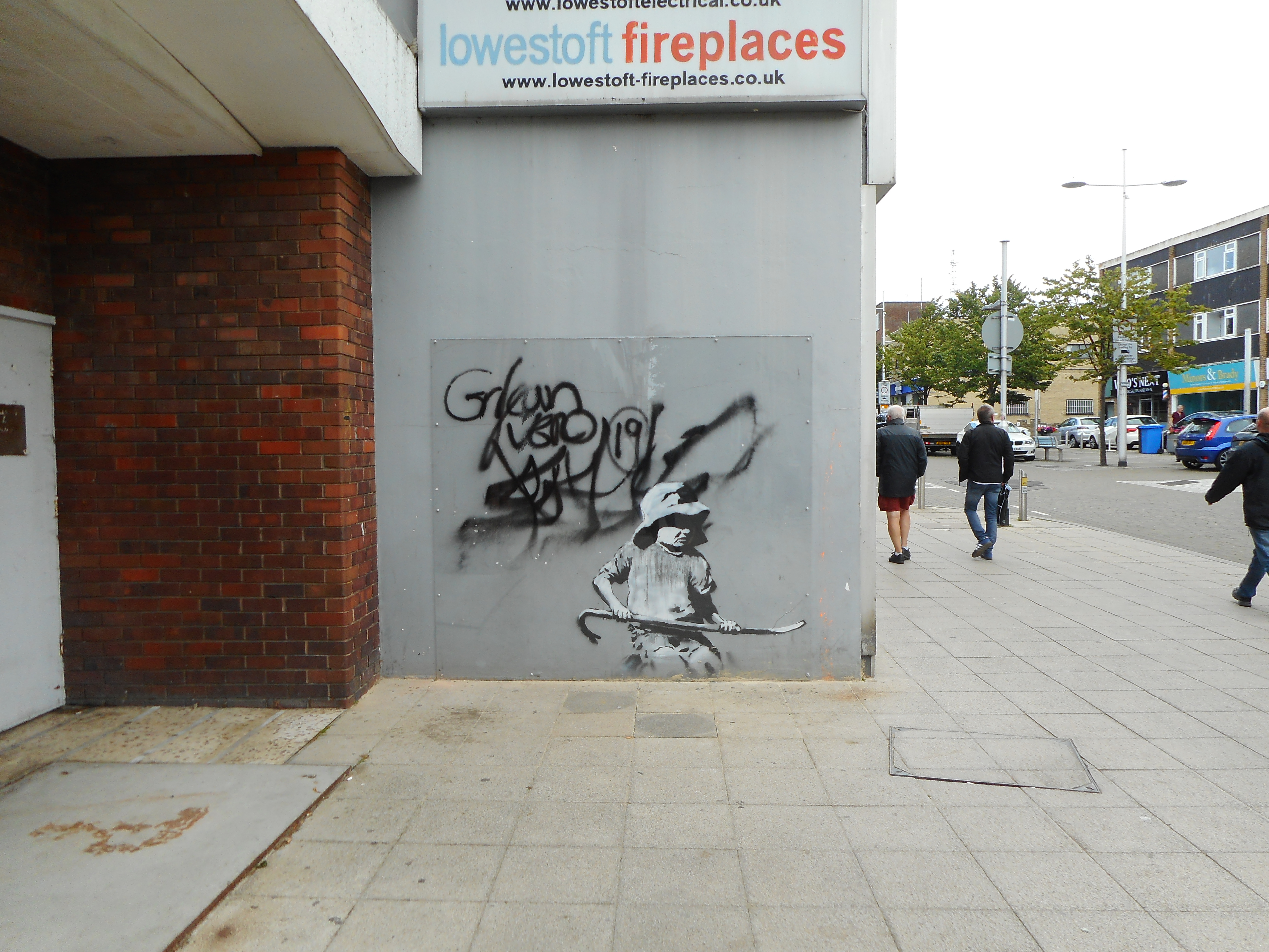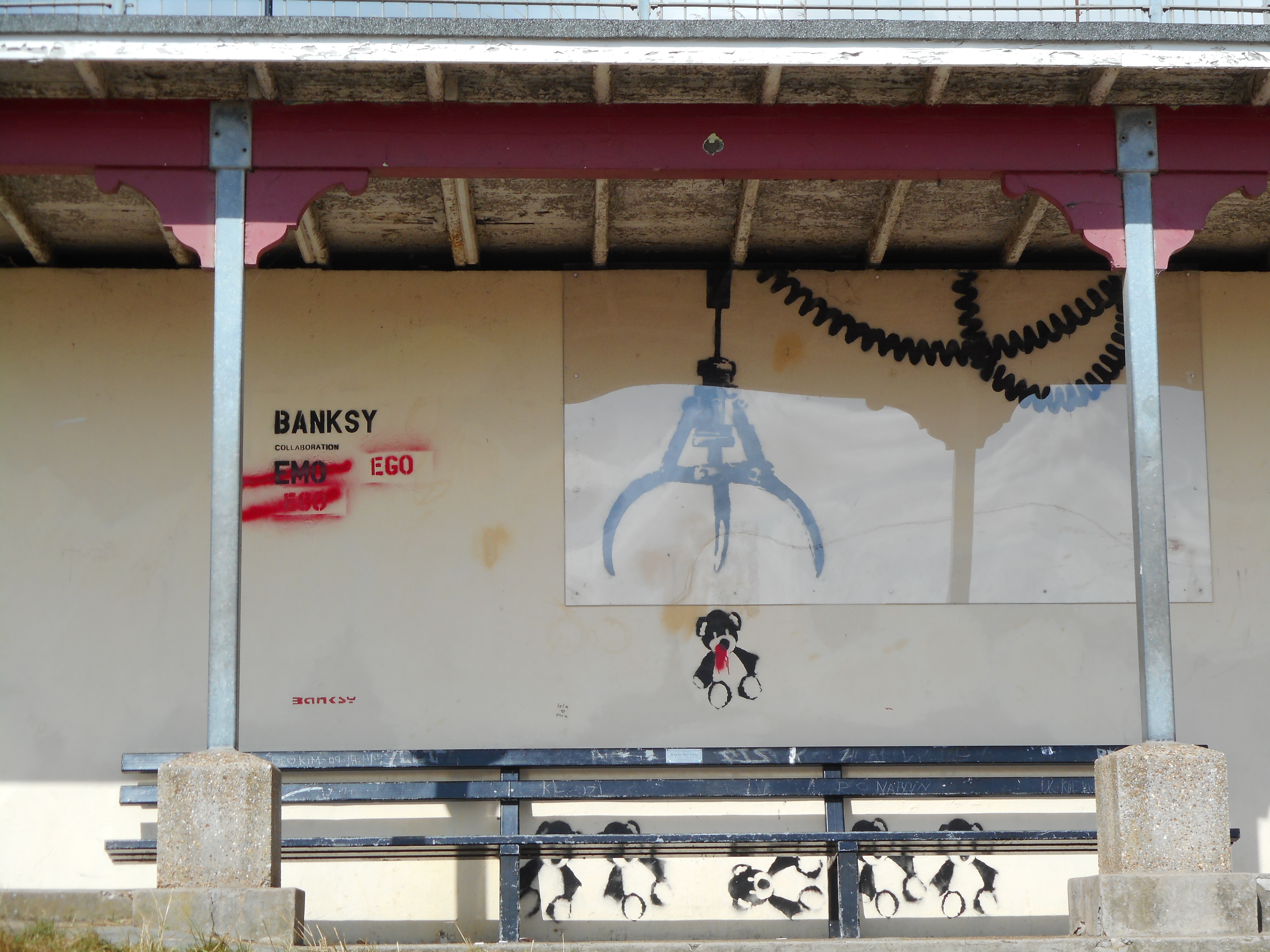 Banksy has also produced a work in Gorleston-on-Sea, a family beach near Great Yarmouth. It has already attracted some controversy: a local graffiti artist called Emo added some teddy bears to the additional design, calling it a collaboration. This prompted others to change Emo’s signature to “Ego”, presumably to mock his nerve to call himself a collaborator with the world-famous if somewhat elusive artist. Being fairly ignorant of street art etiquette, I find this quite amusing. Street artists in my own home town appear to spray over and next to each other’s work all the time, if only because of a lack of space. I quite like the fact that Banksy’s work is temporary, open to being defaced, rather than being protected and locked away in a museum most people will never visit.