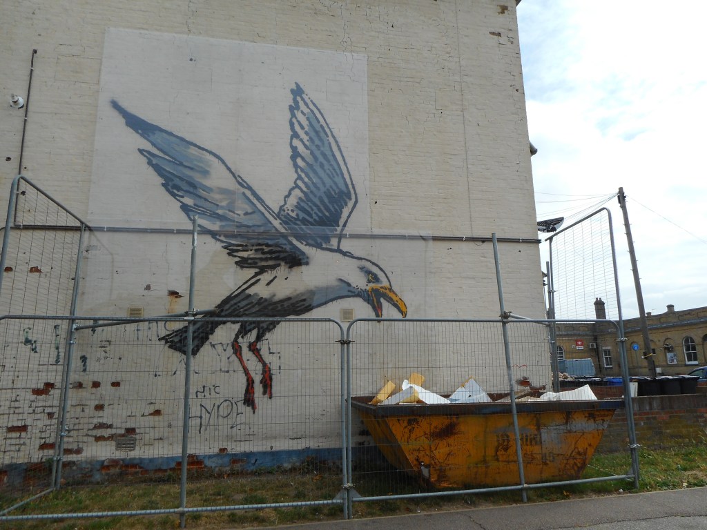 The seagull is the largest work and almost impossible to miss, sitting adjacent to a major road and close to the railway station. Makes me wonder how on earth Banksy managed to paint this without anyone noticing. I’ve been told that you can get away with anything as long as you wear a high-vis jacket, but you’d expect someone painting a huge seagull on a wall in the middle of the night would attract at least some attention from the powers that be. Apparently not. I was told by someone walking by that the contents of the skip resemble chips, a resemblance I hadn’t yet spotted myself, and was pleased to be made aware of.